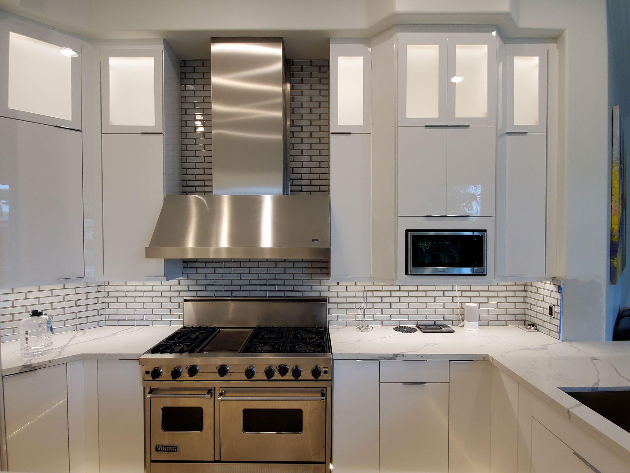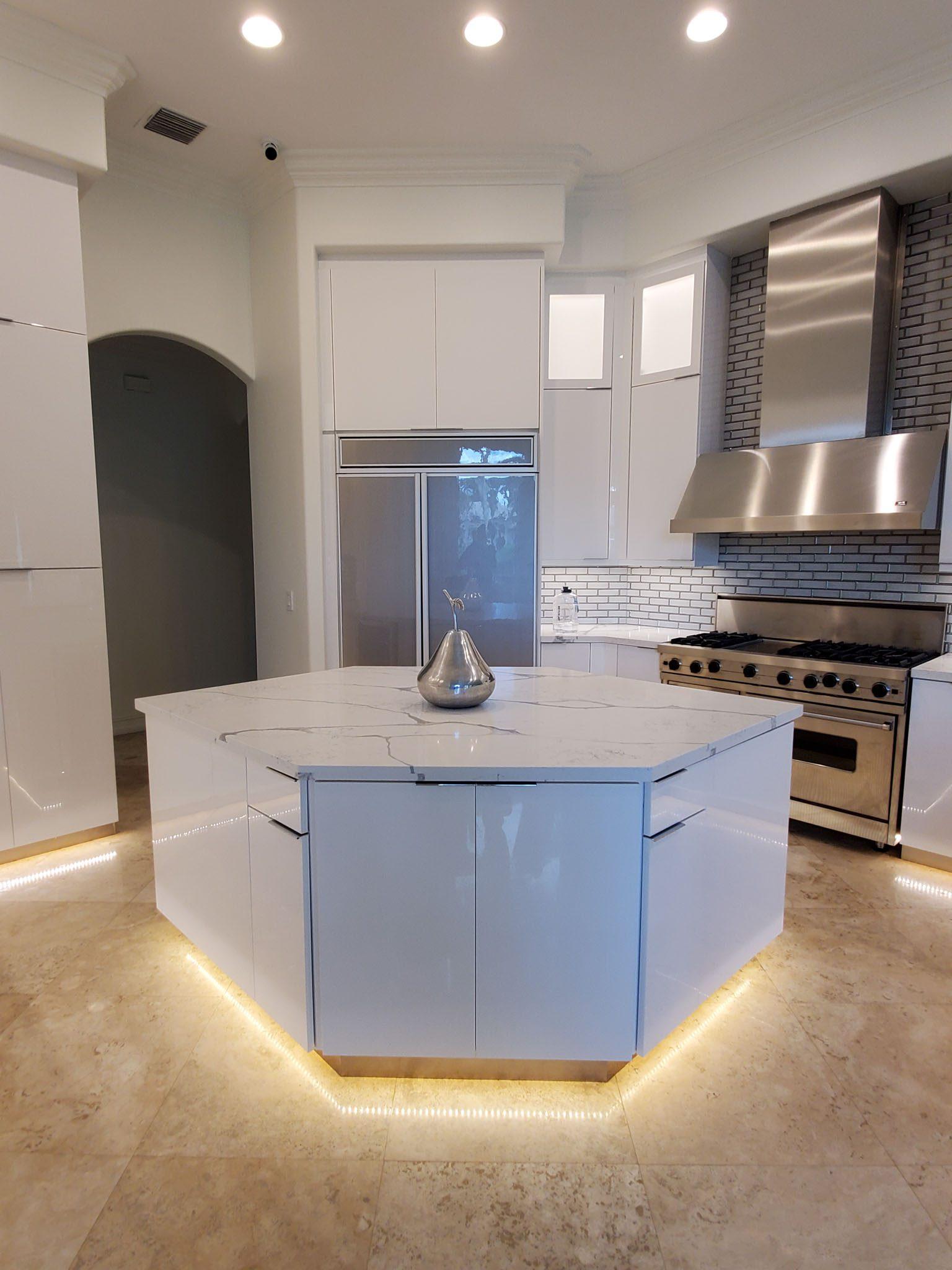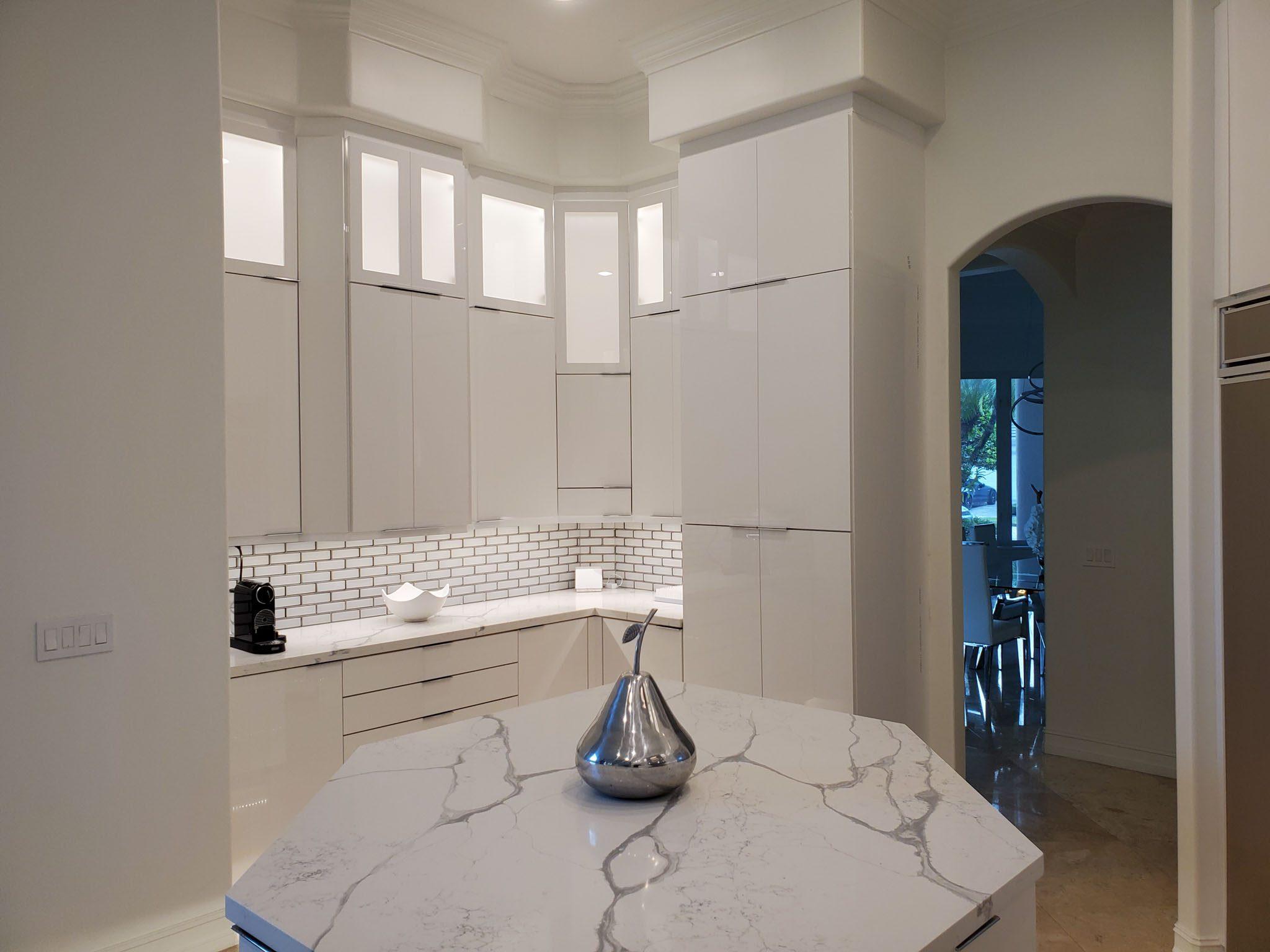 High-Gloss Design and Finishes: The cabinets were selected with a high-gloss finish to maximize the feeling of light and luxury, complemented by high-visual impact countertops. Additionally, the electrical installations were adapted to accommodate the specialized appliances required by our client.