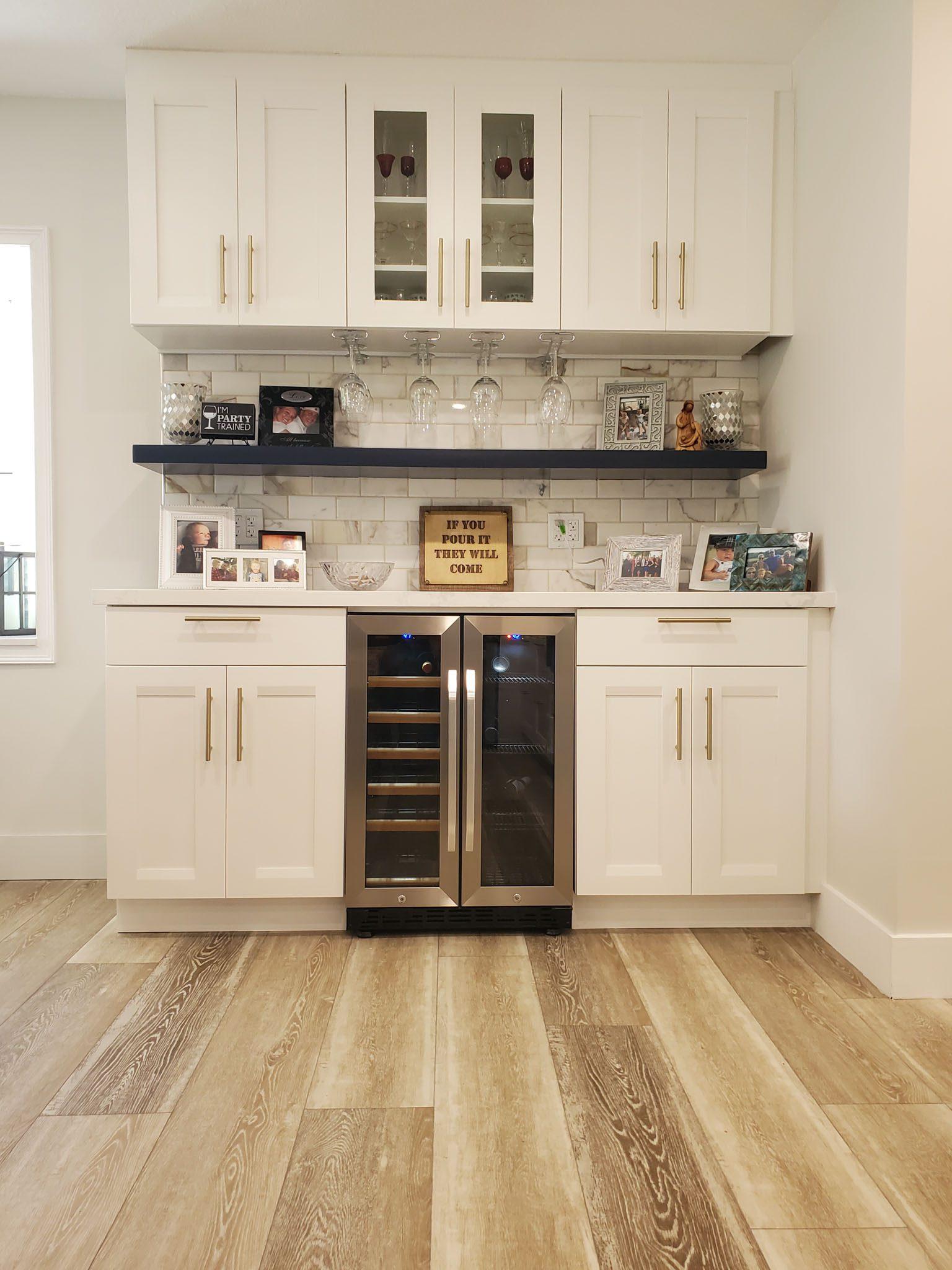 Luxury and Detailed Functionality: Premium finishes were incorporated with a combination of quartzite on the island and porcelain on the countertops. The kitchen was designed for family life, including an oven wall, a central area dedicated to a coffee/breakfast station, and a bar space with cabinets, floating shelves, and a wine fridge.