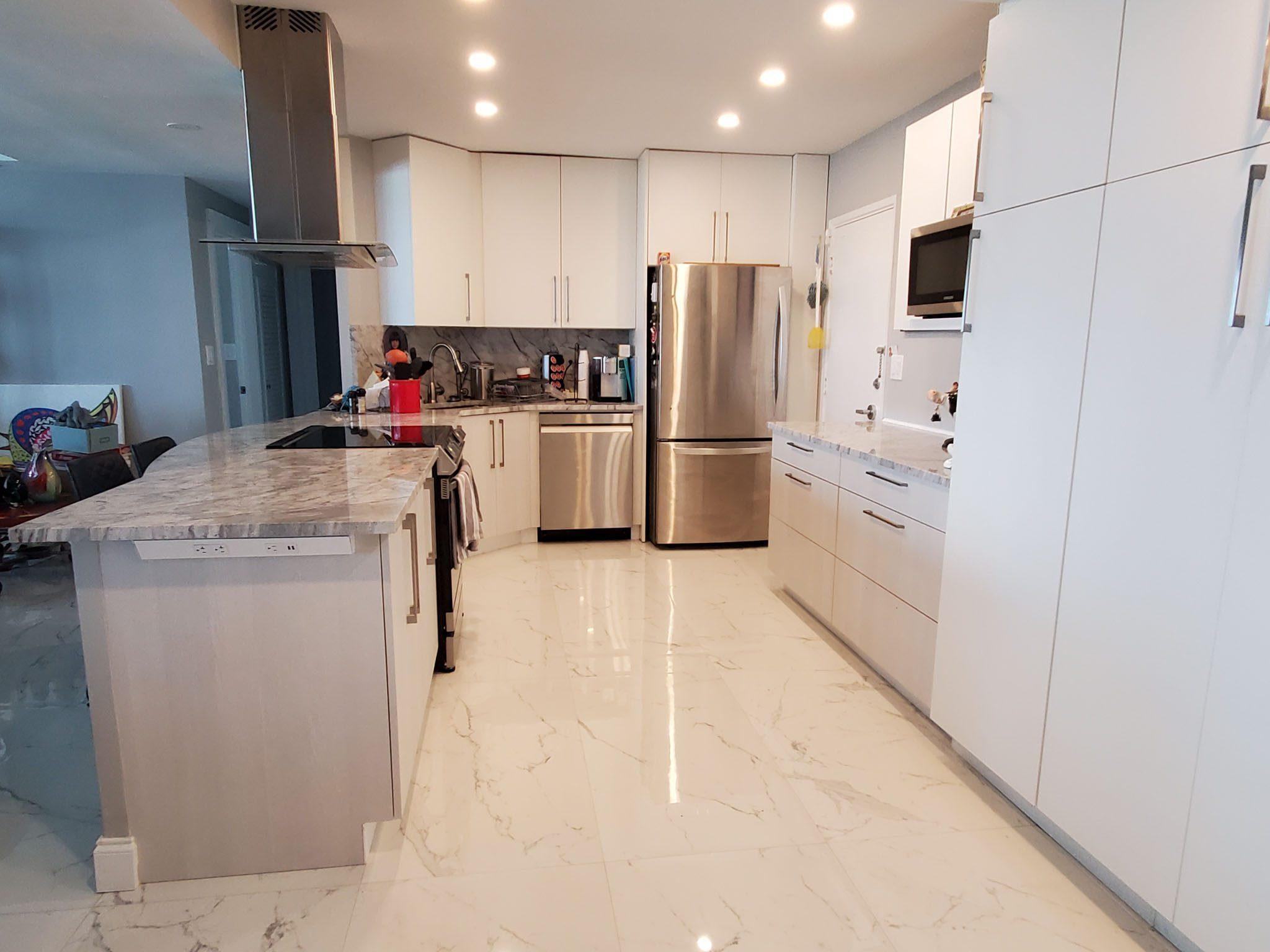 Luxury Design and Finishes: The kitchen design used two-tone light cabinets (light gray wood-look laminates and white) to increase the sense of spaciousness. The countertops were clad with a “white” granite with gray veins, which complement the brightness of the glossy porcelain (24×48) used throughout the apartment. Additionally, one of the bathrooms was modernized to harmonize with the new style.